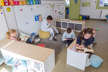 Eerst lezen de kinderen in duo’s samen hardop in zelfgekozen boeken. Als dat vlot genoeg gaat, lezen ze in stilte.